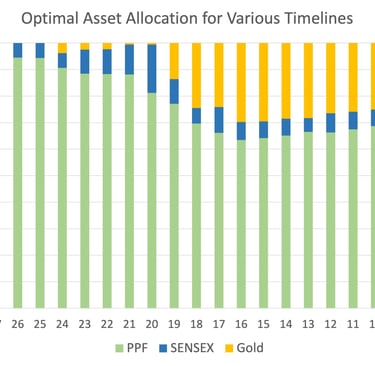 Gold was an enigma. For long durations 20-30 years it hardly gets any allocation but between 6-19 it outflanks SENSEX. To try and understand why gold is getting such high allocation, I checked correlation between the 3 asset classes for different timeframes 10, 15, 20 and 30 years (Fig.2) on a rolling returns basis. I found that the correlation between gold and PPF was way more negative than between SENSEX and PPF. Negative correlation implies that when price of one asset goes up, the other goes down and vice versa. For 20 years retirement paths, the last viable retirement path is May-'04 to May '24. For all the 20-30 year paths, PPF stayed high 8-12%. But as the horizon shortens to 15-10 years we start seeing paths with much lower PPF. That and the fact that gold took off around mid 2000 are the reasons why we are a see smattering of gold for the lower time frames. Overall, Gold seem to be playing a great balancing act between PPF and Sensex.