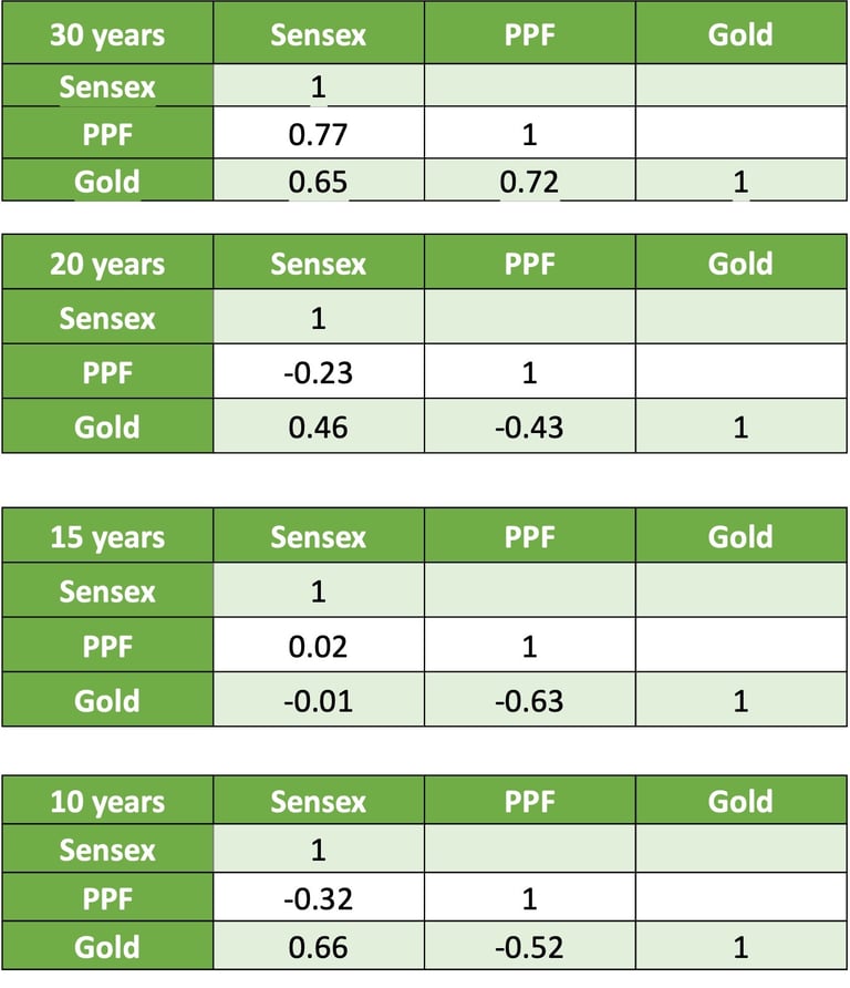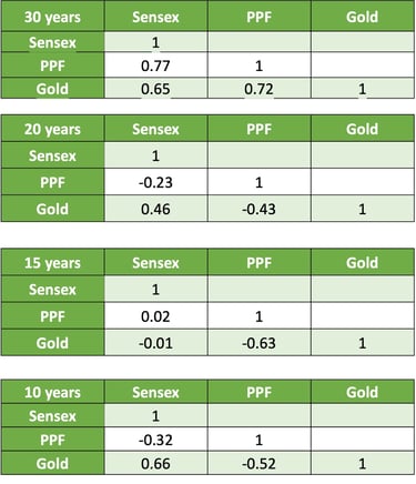 Fig 2. Correlation between SENSEX, PPF and Gold rolling returns of 10, 15, 20 and 30 years