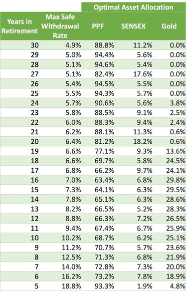 Leaning on PPF, 80% PPF with 10% of SENSEX and 10% Gold looks like an a workable allocation across longer tenures. Refer to Table 2. for comparison between 80% PPF-10% SENSEX-10% Gold combo vs Optimised Withdrawal Rates for various timeframes.