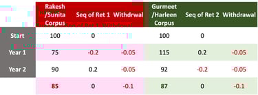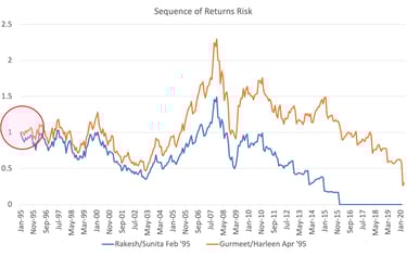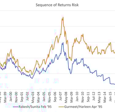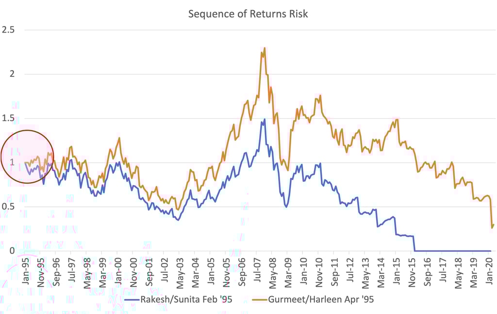 The same can be projected on the real world. Rakesh and Sunita retired in Jan’ 95 and put their life’s savings in Sensex by end of Jan. Gurmeet and Harleen followed them couple of months later in Mar-Apr’95. They both chose 5% Withdrawal Rate (The first year withdrawal as percentage of their starting corpus, adjusted every year based on prevailing inflation). Over the next 25 years, Sensex returns for both the couples were ~10% CAGR. However, the first year returns for Rakesh were negative, -19% (before yearly withdrawal) while for Gurmeet were positive +3%. This is highlighted in Fig. 1. In the second year, Rakesh and Sunita gained 15% while Gurmeet and Harleen stayed the same and yet there was 11% gap in their corpus. All this happened right at the beginning of their Retirement Yatra. As a result while Gurmeet and Harleen made it to Mar '20 with some gas still in the tank(Remember Mar '20 was the worst of Covid) while Rakesh and Sunita, ran out of money post 2016 withdrawal.