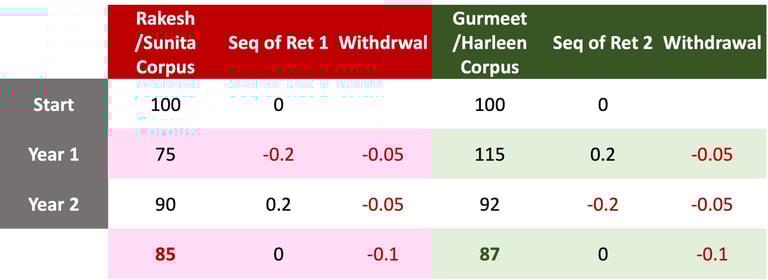 The twist comes in when retirees make these investments to fund their retirement yatra. Being a retiree implies they must withdraw some money every year to run their household. It’s this withdrawal that makes the “Sequence of Returns” so dangerous. Let’s take the above example and add 5% withdrawal to it at the end of each year. Refer to Table 2. As you can see, Rakesh and Sunita, the unfortunate couple got the wrong draw. They lost 20% in the first year and had to withdraw 5%. Despite a 20% gain in the second year, at the end of the 2 years, their corpus has depleted to Rs.85. Gurmeet and Harleen on the other hand who gained 20% in their first year, end the second year with Rs. 87. From here on even if for the rest of the retirement years , both the couples get the same returns, Rakesh and Sunita will progressively fall behind. Or they are at a higher risk of “Portfolio Failure” than Gurmeet and Harleen because their base has shrunk while expenses remain the same.