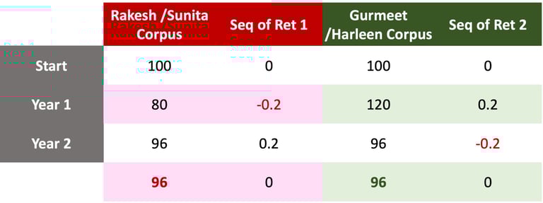 Let’s say Rakesh and Sunita invested Rs. 100 in an Index. The first year they lost 20% but in the second year they gained 20%. At the end of the period, their corpus is Rs. 96 = 100 x (1 - 0.2) x (1 + 0.2) Refer to Table 1. Similarly, Gurmeet and Harleen invest in another Index which gives the same returns, but in reverse. They gain 20% in year one and lose 20% in year 2. At the end of year two they have the same corpus as Rakesh and Sunita, I.e. Rs 96 = 100 x (1 + 0.2) x (1 - 0.2).
