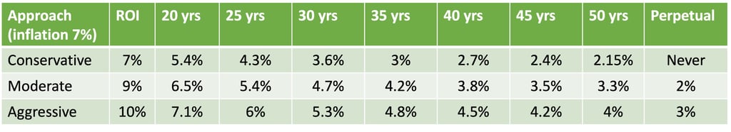 As a ready reckoner, I'm putting down the withdrawal rates based on the three approaches and the planned time period. Remember the equation for perpetual corpus?