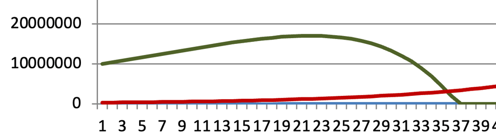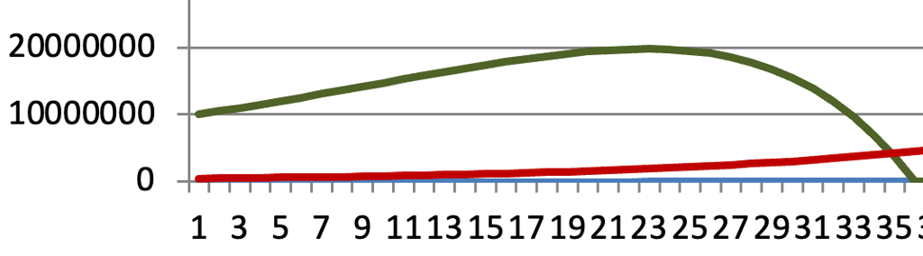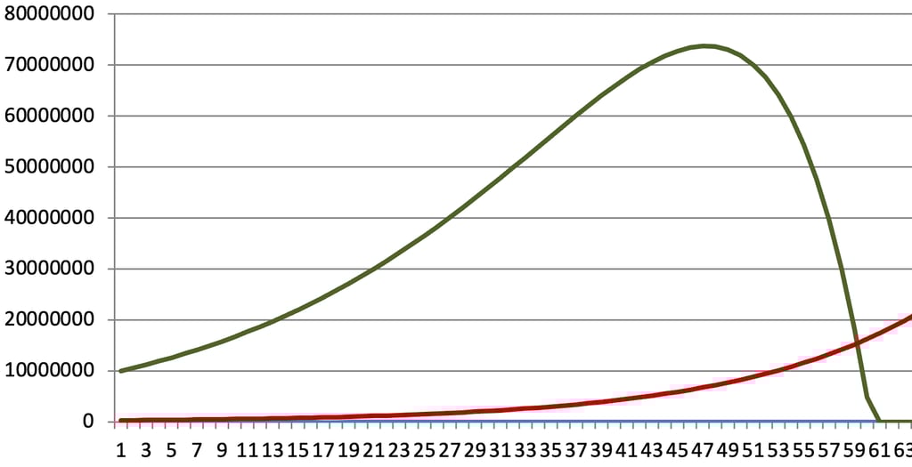 Curve 1 Conservative Plan - Do you prefer 100% surety for your cashflows year after year, or are you okay with variability? If you are someone who likes to be doubly sure of your cashflows, then you are a conservative investor. You may want to choose low risk or risk free instruments as your investment vehicle of choice(such as long term treasury bonds, FD, PF etc.). This way you’ll have great surety of returns and cashflows. The returns themselves will likely stay close to inflation as these are risk free investments. For such investments, your financial retirement curve will look like Fig. 1. with the assumption that your returns match inflation (7%). You may notice that the corpus(Fig.1Observe the green line) keeps growing in the initial years despite you taking out part of it to meet your expenses every year. It starts at Rs. 1Cr and keeps increasing year after year even as you keep withdrawing every year adjusted to inflation. But don’t be fooled by it. As you get closer to the end of your planned timeline, the corpus maxes out around 2/3 rd of the way. That’s the year your expenses exceed your annual returns. From that year onwards, the decline in the corpus is swift and steep. So, be sure you choose the timeline well, giving yourself enough room. No one wants to spend the last years fretting about money. The long and short of a conservative plan is that, While there is great surety around the cashflows during the planned timeline, there is equal surety that they will dry up at the end of the projected timeline.
